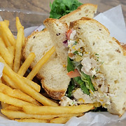 A chicken salad made with chicken breast, nuts, fruit, lettuce, tomato, red onion on a multi grain bread. Served with french fries.